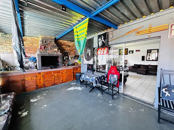The kitchen boasts ample cupboard space and a gas stove, flowing into a cozy lounge with a fireplace. A spacious family lounge overlooks a covered entertainment area with a built-in braai, ideal for hosting and relaxed family gatherings.
