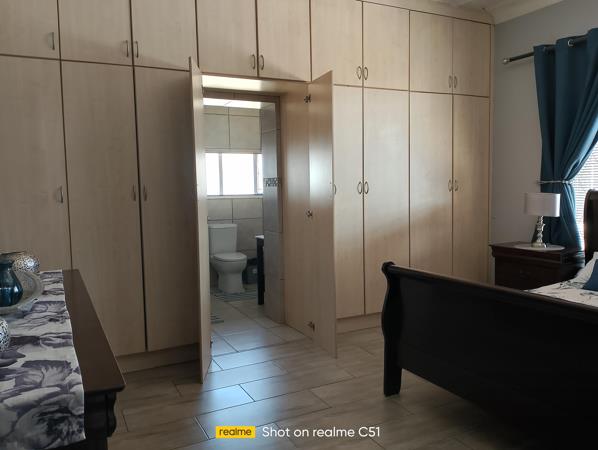 The spacious main bedroom is fitted with an air conditioner and built-in cupboards, and features a luxurious full en-suite bathroom complete with a double shower, corner bath, basin, and toilet.