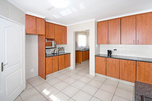 The home features three spacious bedrooms and two full bathrooms (both with baths and showers, including a main en-suite). The modern kitchen is equipped with sleek granite countertops, a pantry, a separate scullery, and ample cupboard space. The open-plan lounge and dining area, enhanced with downlights, leads out to a large, pet-friendly garden perfect for kids to play and for outdoor entertaining.