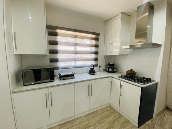 Upon entering, youre greeted by a stylish entrance leading to a spacious open-plan lounge and dining area, separated by a cozy fireplace. The modern kitchen boasts granite countertops, an eye-level oven, a 4-burner gas stove, a 4-plate electric stove, both with extractor fans, as well as a scullery and laundry room. A guest toilet adds convenience on the ground floor.