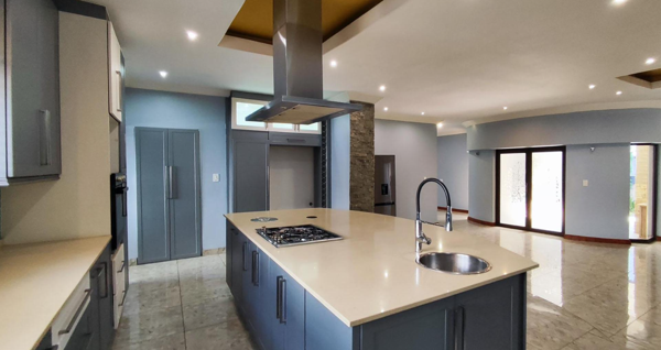 Step inside to an inviting open-plan layout, where modern tiled flooring flows seamlessly throughout the main living areas. The interior is characterized by light blue walls, impressive tray ceilings with recessed lighting, and decorative chandeliers, creating an atmosphere of sophistication. A stylish, stone-clad built-in fireplace serves as a focal point, while large glass sliding doors invite natural light and offer access to the garden. The contemporary kitchen is a chef''s delight, featuring a large central island with an integrated hob and sink, an overhead extractor fan, and ample two-tone grey and cream cabinetry. A separate scullery/utility area provides additional convenience, and unique curved architectural features add character to the adjoining living space.