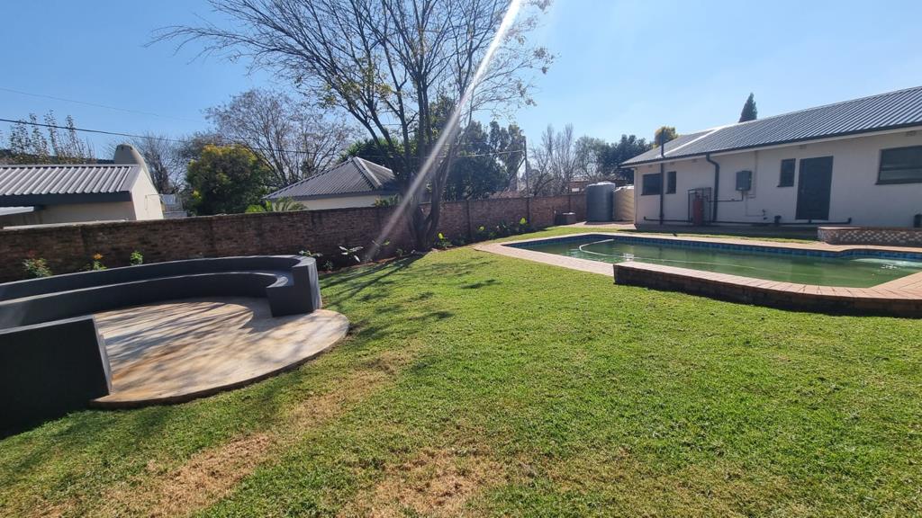 A large inviting patio with a built-in-braai overlooks a sparkling swimming pool perfect for summer days.