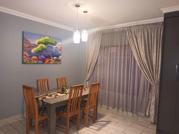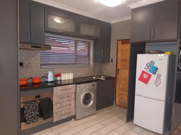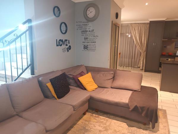 Modern Townhouse. Stunning double storey townhouse in a secure complex. The Three bredrooms have built in cuoboards and the study opens onto the balcony. The two bathrooms have modern finishes and the kitchen is fitted. The living area is spacious with a separate diningroom. There is a single garage and undercover enclosed carport with a small garden.