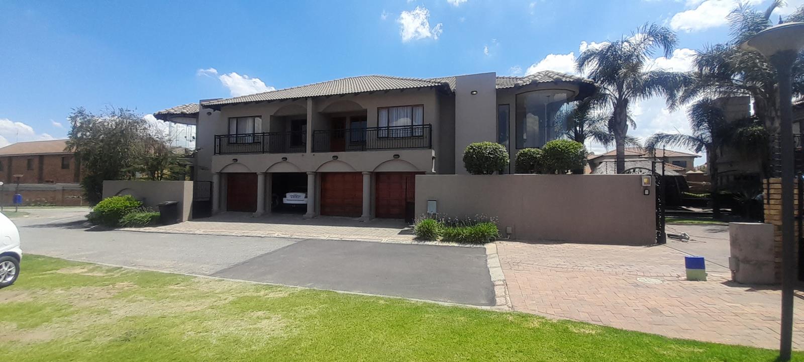 Commanding a distinguished presence within the esteemed Sonneveld estate in Brakpan, this magnificent residential offering epitomises sophisticated suburban living. The property immediately captivates with its architectural elegance, featuring a striking two-story design, multiple balconies, and a distinctive curved glass section that bathes the interiors in natural light. A modern wooden front door, flanked by elegant columns and a paved driveway, sets an inviting tone.