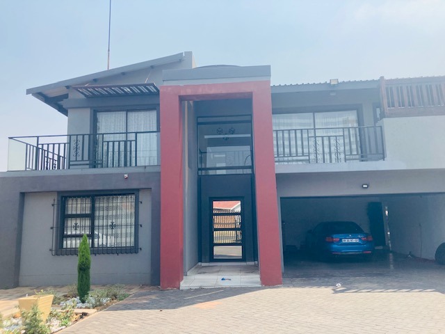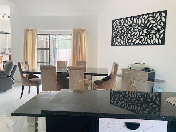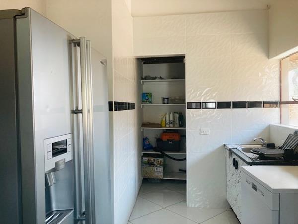 When entering the home, it flows to a private lounge on the right hand side and when going straight through to a living room and beautiful bar which in turn leads to the swimming pool outside. Entertain family and friends. Modern open plan kitchen with granite countertops, top of the line appliances, for a breakfast nook. Beautiful bar with built in wine rack. Private backyard with sparkling swimming pool, lush garden with matured trees. Double garage with additional storage space, automated doors, secure parking for 4 vehicles. Security features an alarm system, secure entrance with automated gate.
