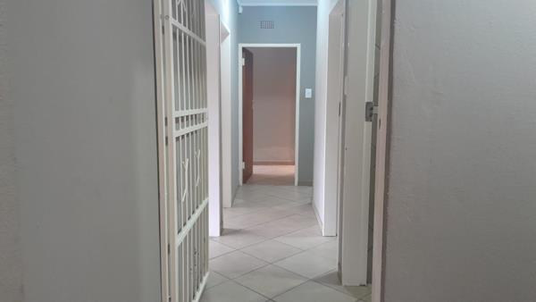 The heart of the home boasts a spacious open-plan lounge and dining area, flowing into a modern kitchen with ample cupboard space and sleek finishes. All three bedrooms are generously sized with built-in cupboards, and the main bedroom includes an en-suite bathroom for added convenience.