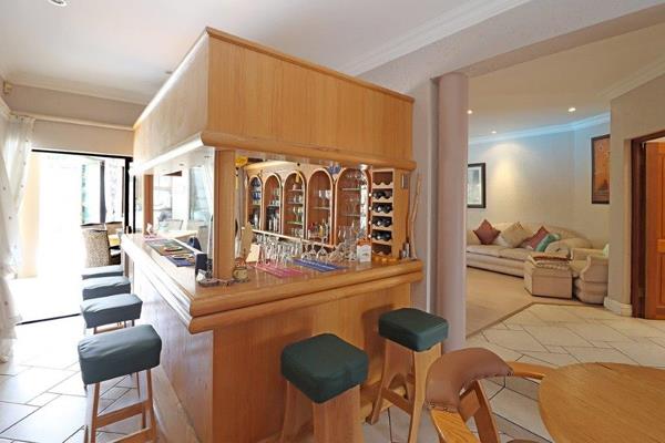 The well-appointed open-plan kitchen, complete with granite countertops, ample cabinetry, and space for a double-door fridgefreezer, flows effortlessly into the living areas. A spacious scullery and laundry with extra cupboard space add valuable convenience. The kitchen includes its own cozy dining nook with a granite-fitted table overlooking the television room.