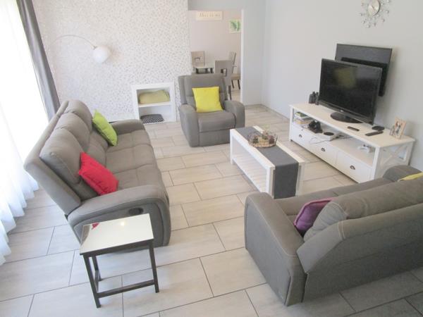 Step inside and you''ll find a modern, clean aesthetic flowing through the open-plan living spaces. The comfy living room, with its stylish grey reclining furniture and light-colored tile flooring, features a cool textured wall and opens up beautifully to the dining area. Its the perfect spot for chilling out or hosting friends.