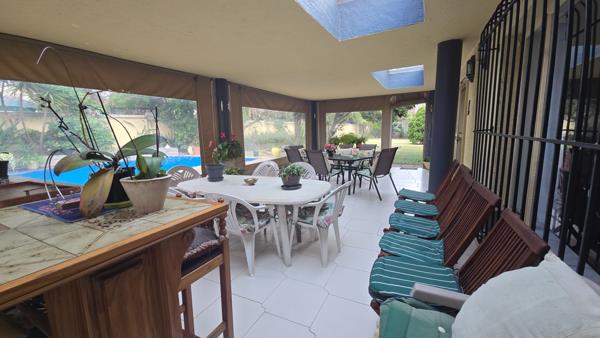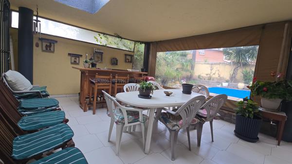 This is a rare opportunity to own a spacious and versatile family home in the highly sought-after Dowerglen Ext. 3. Set on a generous double stand, the property offers ample room to grow and personalize to suit your family''s lifestyle. The centerpiece of the home is a large, covered patio fitted with blinds to shield against wind and rain, creating a perfect all-weather entertainment space that overlooks a sparkling pool and a beautifully maintained garden. Inside, the open-plan eat-in kitchen connects seamlessly to a spacious family room, both of which open onto the patio for effortless indoor-outdoor living. Three comfortable bedrooms are located downstairs and share a full bathroom with both a tub and shower, while a guest loo adds convenience. The entrance hall leads into a double garage, an open atrium, and a separate lounge and dining room with direct access to the kitchen. Upstairs, the private main bedroom features a full en-suite bathroom and a covered balcony with tranquil garden views. The home is fully equipped with solar panels and backup batteries, offering energy efficiency and peace of mind. As a resident of Dowerglen Ext. 3, youll enjoy access to a beautiful park and damperfect for children to play and dogs to roam. Additional parking is available in front of the garages, making this home as practical as it is inviting.