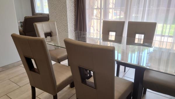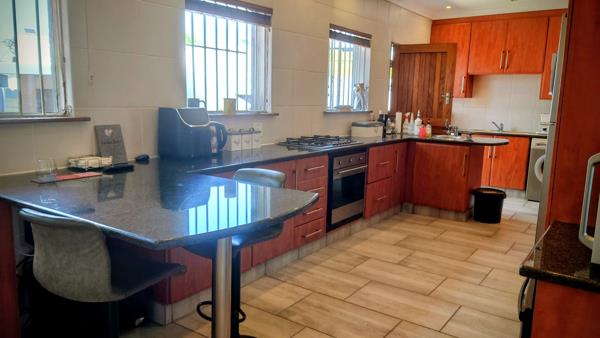 Situated within the secure Dowerglen boom, this spacious home offers the perfect retreat for an extended family. A welcoming front garden and sparkling blue pool lead you to the entrance and into a generous lounge area. The dining room flows into a well-established kitchen, featuring cherrywood built-in cupboards and sleek black granite countertops. A breakfast table adds charm, while a semi-separate scullery provides space for all your appliances.