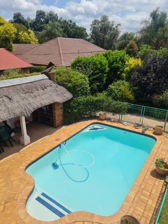 For further comfort the pub and lounge area have sliding doors onto a covered patio overlooking the garden, solar-heated pool and lapa fitted with a gas braai.