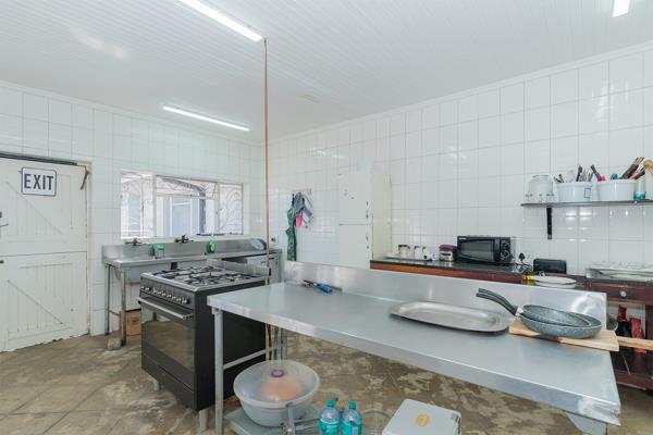 The industrial-sized kitchen is fully equipped with a gas cooker, double-door fridges, stainless steel work surfaces, a double sink, and laundry area. It leads out to a large alfresco dining area, ideal for outdoor meals or social gatherings.