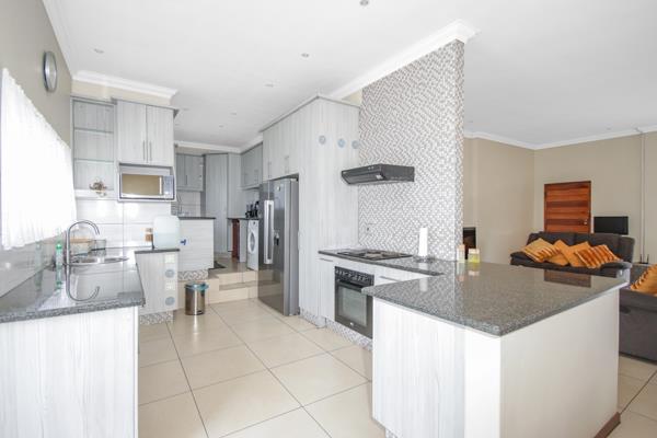 The main house features five generous bedrooms, all with modern tiling. One of the bedrooms is located downstairs and includes its own kitchenette, making it perfect as a teenage pad or guest bedroom. The home also boasts three beautifully renovated bathrooms, including two en-suite bathrooms. The modern kitchen is equipped with sleek granite countertops, a separate scullery area, and plenty of cupboard space. The open-plan lounge and dining area are designed with downlights, creating a bright and inviting space.