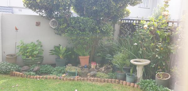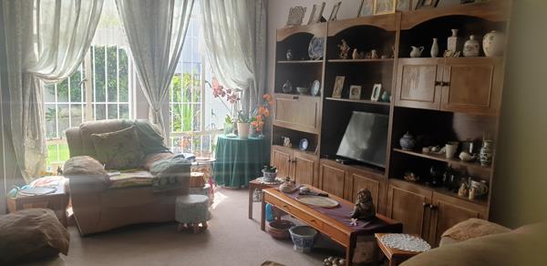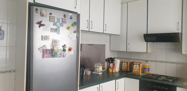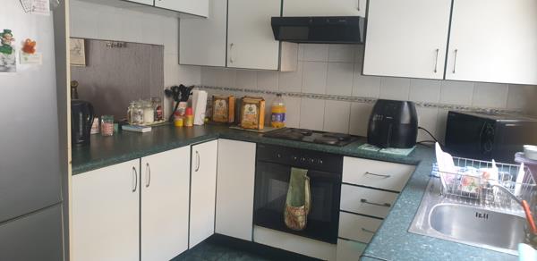 Kitchen has white cupboards and dark tops and space for all appliances and plenty storage and hatch to diningroom