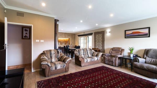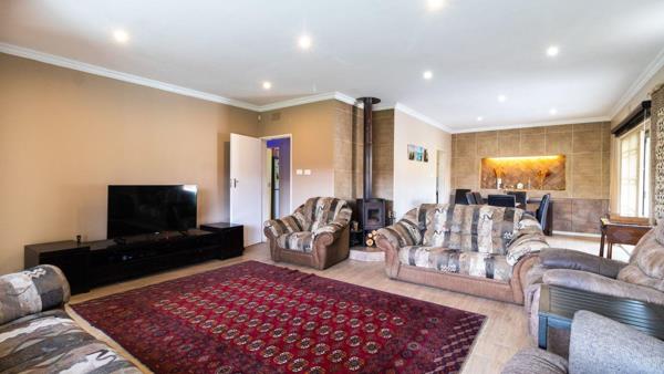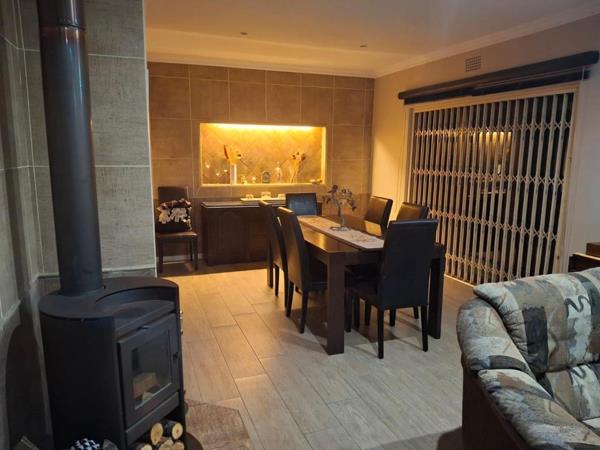 Nestled on a prime corner lot in the desirable Eastleigh Ridge Enclosure, this charming residence features three inviting bedrooms and two bathrooms. Additionally, the home offers a fourth upstairs bedroom with its own lounge and bathroom, providing extra privacy for guests or family members. The living space includes a warm lounge adorned with a wood-burning fireplace, a versatile T.V. lounge, and a dining room that leads to a generously sized covered patio. This outdoor space is perfect for gatherings, complete with seating and a built-in braai equipped with lighting.