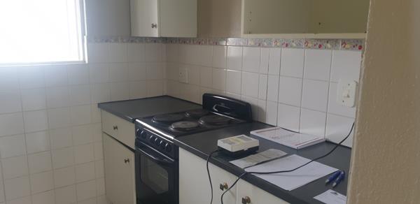 Both bedrooms are generously sized with large windows allowing natural light, and each is fitted with built-in cupboards. The bathroom includes a bath, shower over bath, basin, and toilet.