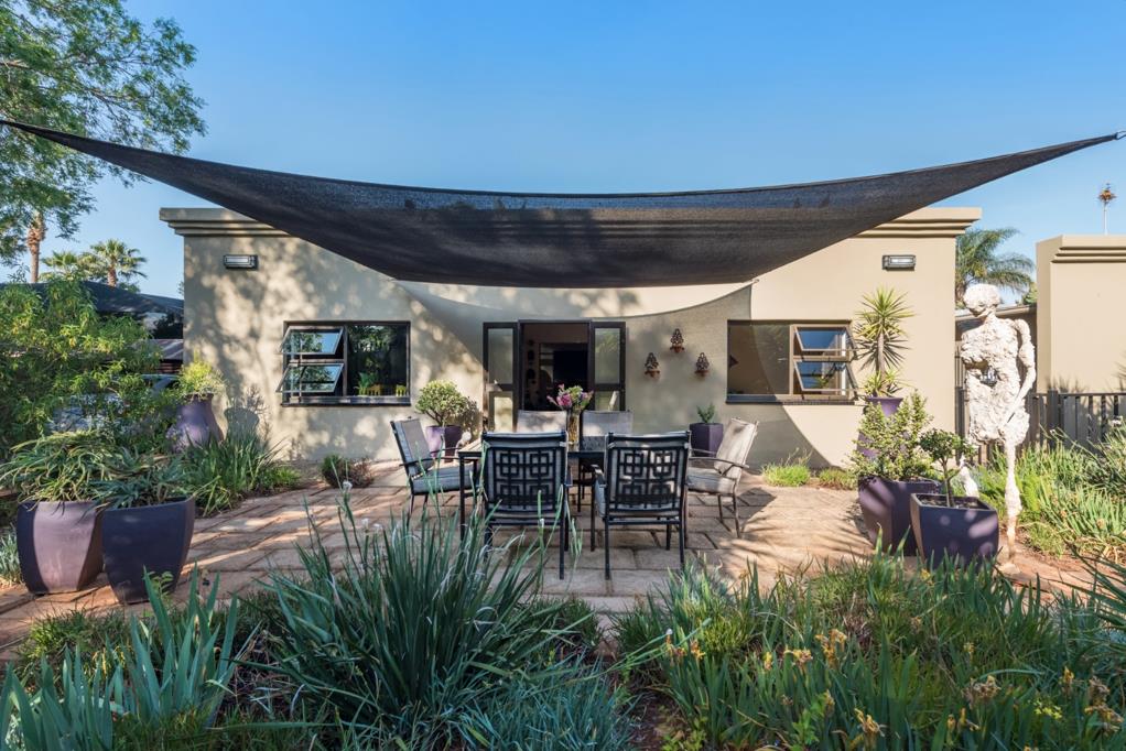The main house is completely separate from the two cottages, providing privacy for all occupants. It features a spectacular front patio surrounded by a tranquil, landscaped garden, as well as a spacious back patio ideal for entertaining. Inside, there are two well-appointed bedrooms with ensuite bathrooms and a guest toilet, complemented by generous lounge and dining areas fitted with stylish American shutters. The kitchen is fitted with melamine countertops, an electric oven, gas hob, extractor fan, and space for two under-counter appliances. The home is built with durable 15-degree IBR sheeting and MultiDex waterproofing for long-term protection. Additional conveniences include a covered shade-net parking for three cars, and open parking for two more.