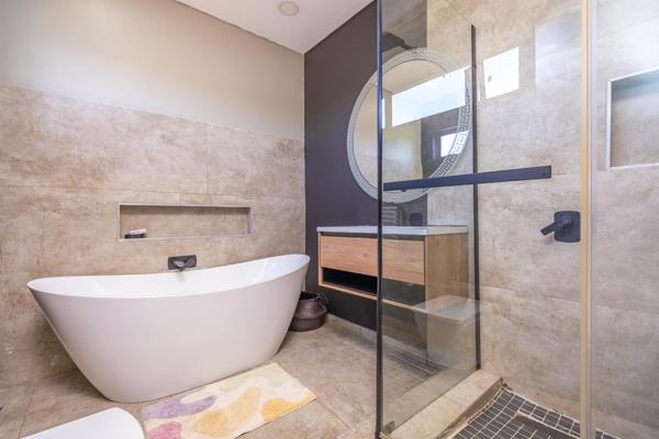 Additional features include a double automated garage with direct access into the house, a stylish glass and aluminium front door, aluminium windows throughout and a low-maintenance exterior with tiled roof, facebrick and plaster farm-style finishes. The home is fully walled, pet-friendly and fitted with a wireless alarm system for added peace of mind.