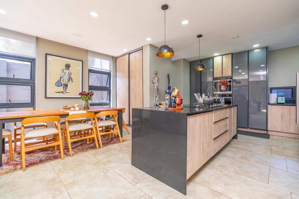 The heart of the home is the contemporary kitchen, featuring granite countertops, generous cupboard space and a movable centre island. A built-in undercounter oven and electric glass hob make everyday cooking effortless, while a dedicated space for a double-door fridge, pantry cupboard and separate scullery with double sink and plumbing for a washing machine and dishwasher keep everything practical and organised.