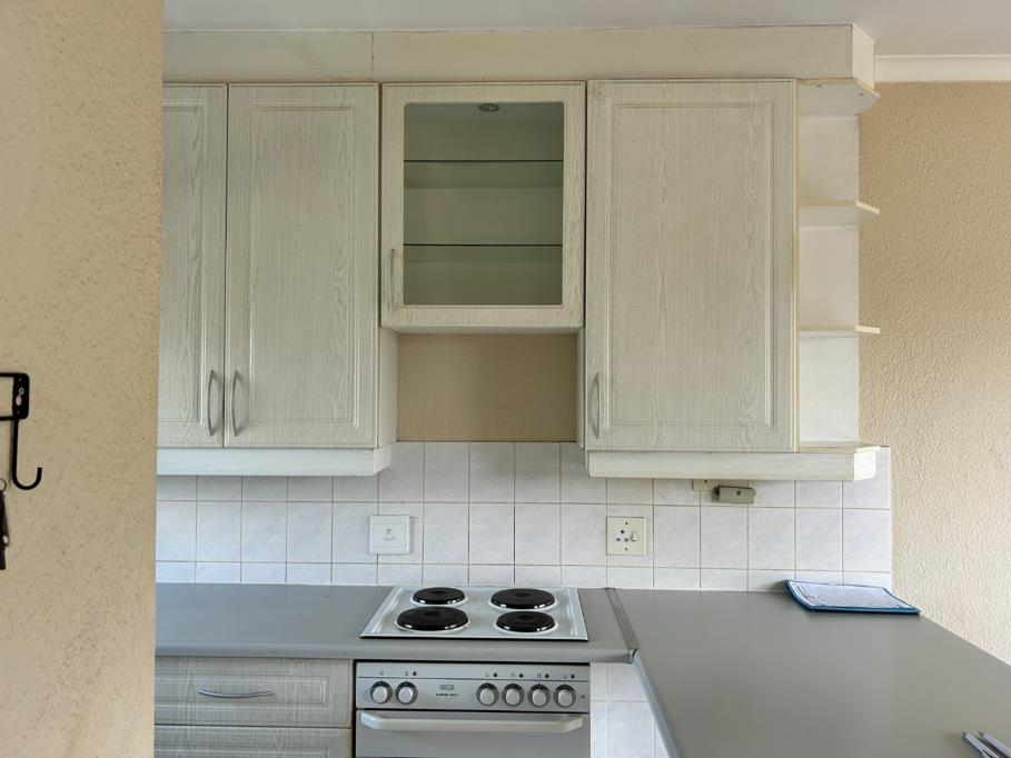 The inviting bedroom features ample built-in cupboards, providing generous storage space. The modern, open-plan kitchen comes equipped with a four plate hob, under counter oven and a convenient space for your fridge, blending functionality with comfort.