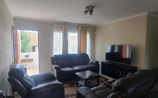 Discover comfortable living in this inviting 3-bedroom, 2-bathroom unit located within a secure estate in Eden Glen, Edenvale. Spanning 87 square metres, this property offers an ideal blend of practicality and community amenities. The interior features an open-plan layout, seamlessly connecting the lounge, dining area, and kitchen, creating a spacious and versatile living environment. Large windows throughout ensure abundant natural light, enhancing the welcoming atmosphere, while tiled flooring provides a clean and durable finish.