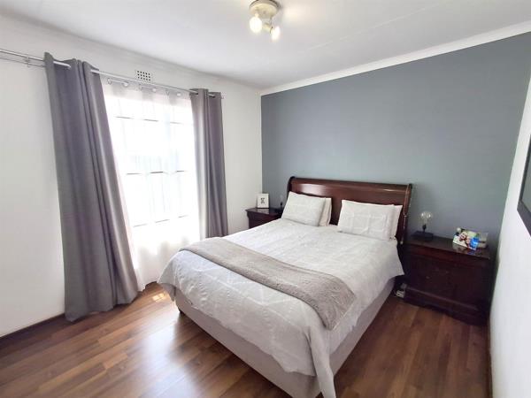 At the bottom of the passage is the smallest bedroom, ideal for children or a work from home office, with built-in cupboards and laminated wood flooring. The main bedroom is a decent size and could accommodate a Queen sized bed. Built-in cupboards and laminated floors. Warm and North facing.