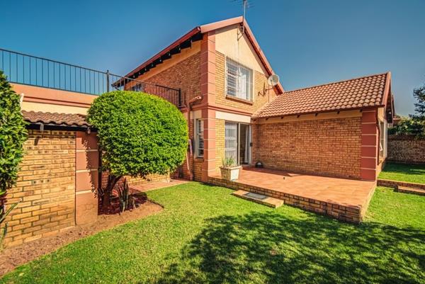 Discover this inviting four-bedroom, two-bathroom residence nestled within a secure estate in Eden Glen, Edenvale. The multi-story home presents a charming kerb appeal with its combination of brick and painted exterior, a well-maintained lawn, and a paved driveway leading to a two-car garage.