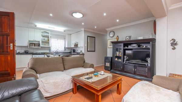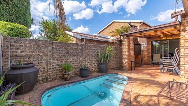 Accommodation includes three bedrooms with built-in cupboards and two beautifully finished bathrooms, including a main en-suite. The living room opens onto a private entertainment area with a built-in braai, small splash pool, and low-maintenance garden perfect for enjoying sunny afternoons and peaceful weekends at home.
