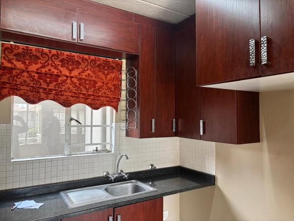 The home features laminate flooring throughout and built-in cupboards in all three bedrooms, creating a neat and practical living space. The open-plan kitchen is fitted with dark and cherry wood cabinetry and provides space for one appliance and a double-door fridge, seamlessly flowing into the living areaperfect for day-to-day living or entertaining guests.