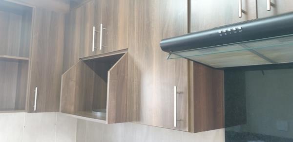 Both bedrooms have modern built in cupboards and tiled floors throughout .