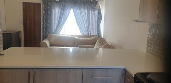 The kitchen is open to the living area, designed for practicality with ample cupboard space and room for appliances.