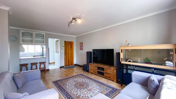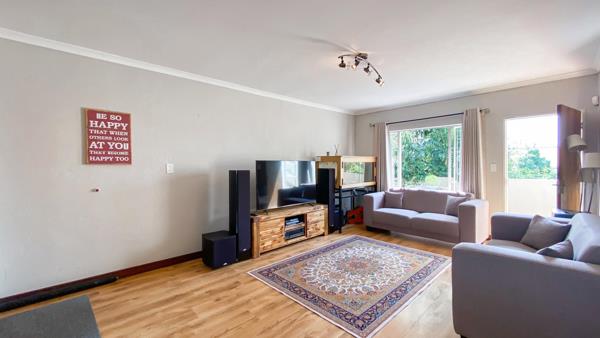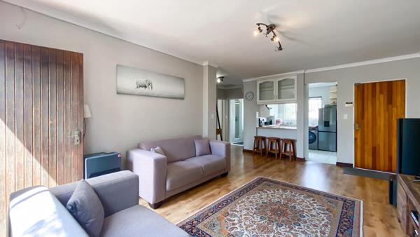 Inside, the home showcases stunning wooden laminate floors and abundant natural light. The spacious open-plan living area includes a lounge and a newly renovated kitchen, flowing seamlessly onto a private balcony, perfect for relaxation.