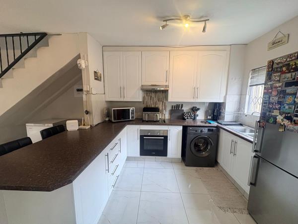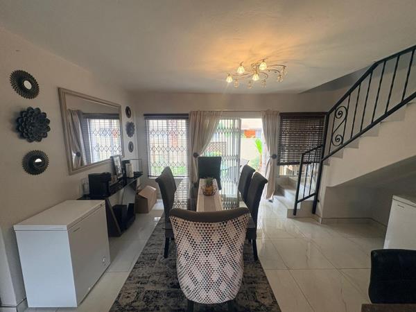 The interior features a well-designed 112 sqm layout, with living areas downstairs and bedrooms upstairs for added privacy. The home includes a dedicated lounge and dining room, providing ample space for relaxation and entertaining. The kitchen is functional, catering to everyday needs, while modern tiled flooring throughout ensures easy maintenance and a clean aesthetic.