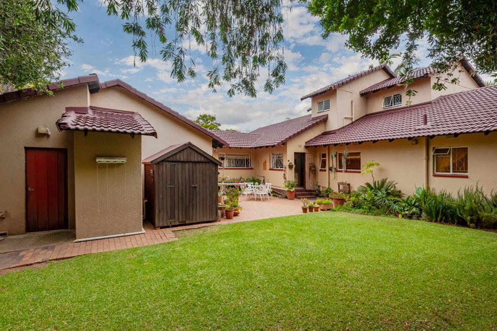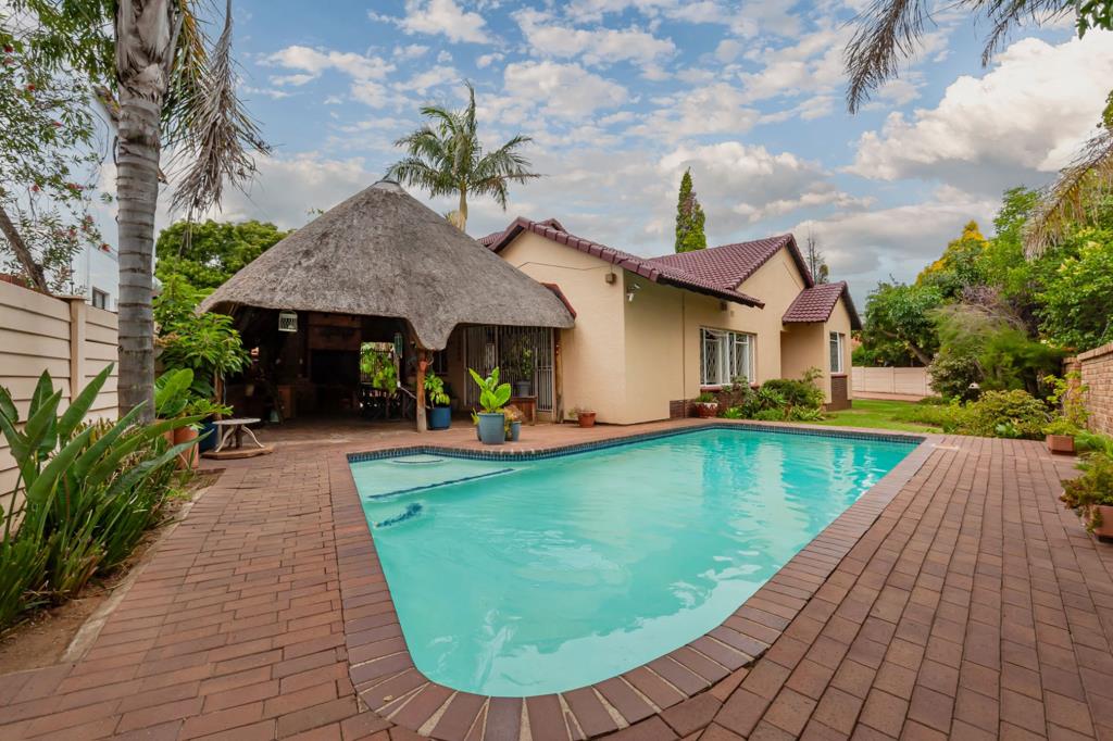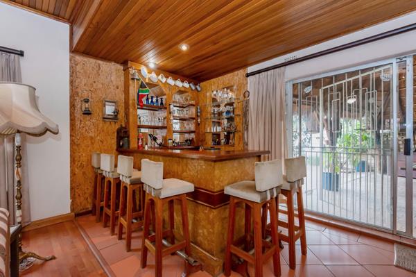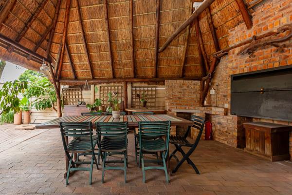 The inviting lounge, complete with a pub area, flows seamlessly to the entertainment space featuring a charming thatch lapa. Overlooking a well-manicured garden and sparkling pool, this is the ideal setting for relaxed family gatherings and weekend entertaining.