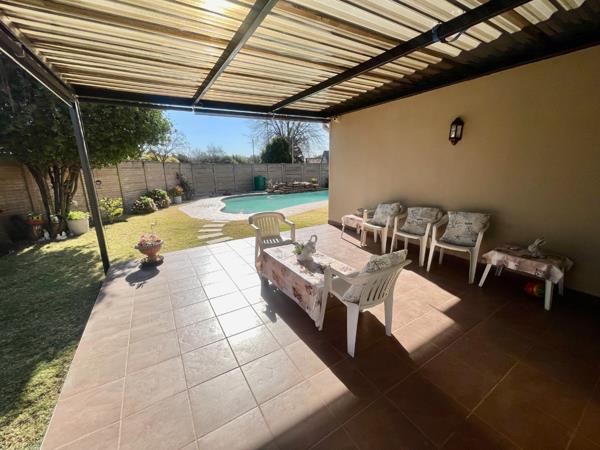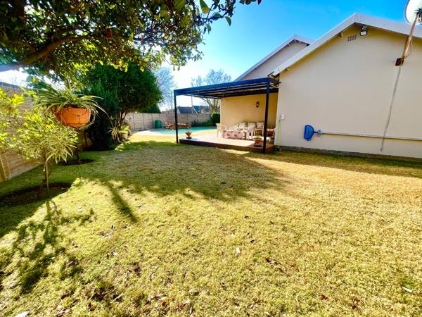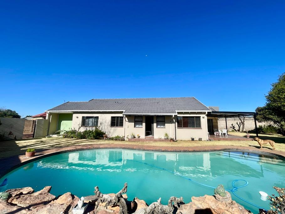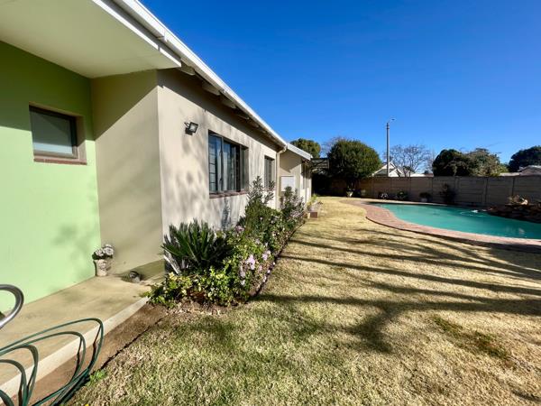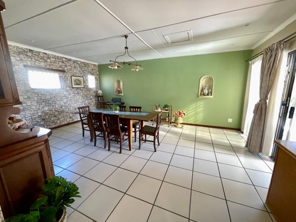 There is a central lounge, which leads to a modern, open plan, eat-In kitchen, boasting ample cupboard space, a breakfast counter, and a state-of-the-art gas stove with a gas oven, perfect for culinary enthusiasts. The kitchen has is a separate scullery:- designed with practicality in mind, offering space for all your electrical appliances. The kitchen flows to an expansive dining room:- perfect for hosting friends and family, this area seamlessly leads onto a covered patio that overlooks a stunning, sparkling pool and rolling lawns in a neat garden.