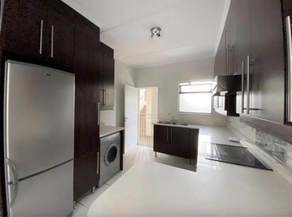 The stylish kitchen includes Caesarstone countertops, ample wooden cabinetry, and comes equipped with a fridge, washing machine, and tumble dryer. The lounge and dining area flow effortlessly onto a large, covered balcony, complete with a built-in braaiideal for entertaining or unwinding while enjoying serene views and sunsets.