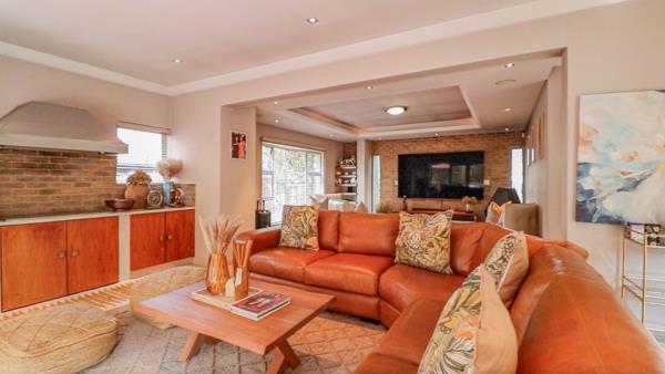 A guest bathroom downstairs ensures convenience when hosting, while the home flows seamlessly to a decked patio with a built-in braai, overlooking a landscaped garden with irrigation and a sparkling pool. This entertainment space is designed for gatherings that linger long into the evening.