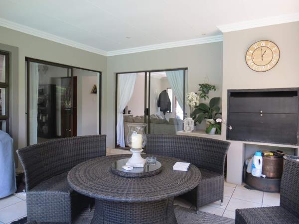 Upon stepping inside, you''ll be greeted by an abundance of natural light and a spacious, open layout. The living room features a cozy wood-burning fireplace and seamlessly flows into the dining room and well-appointed kitchen, which boasts ample cupboard space. A guest bathroom adds convenience to the living area. Outside, a covered patio with a built-in braai provides the perfect spot to enjoy the garden and pool views.