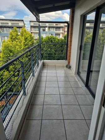 The open-plan kitchen, complete with appliances (fridge, washing machine, and tumble dryer), seamlessly flows into a cozy living area that opens onto a private balcony.