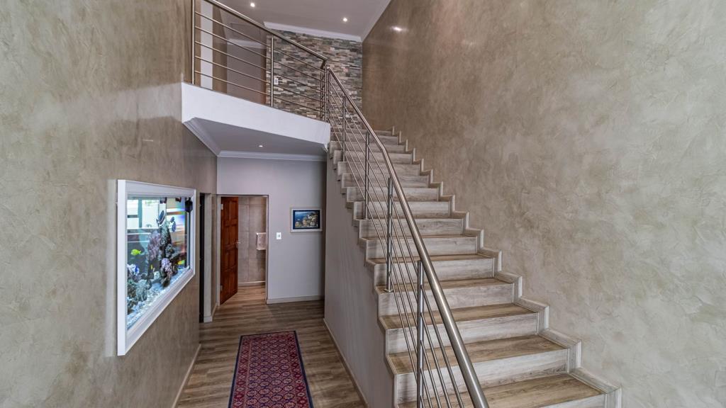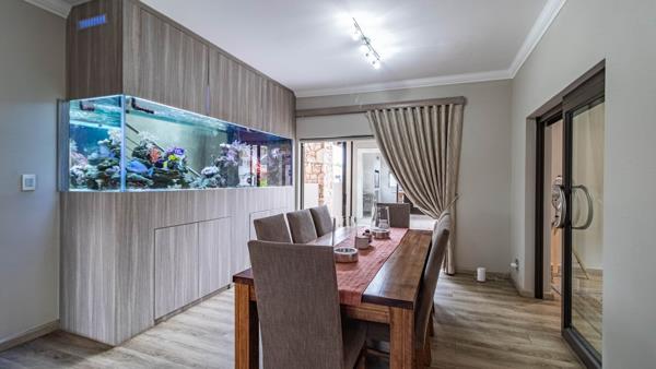 You are welcomed by a dramatic double-volume entrance featuring a stunning aquarium that creates an immediate sense of tranquility. This impressive foyer provides access to a powder room, under-stair storage, and the double automated garage. To the left is the large, open-plan dining room adjacent to a chef''s kitchen appointed with top-of-the-range finishes. This dream kitchen boasts a gas hob, double oven, space for a double-door fridge, ample cupboard and workspace, and a separate scullery with room for water appliances. Both the dining area and kitchen enjoy a captivating view and the soothing sound of the water from the central aquarium.