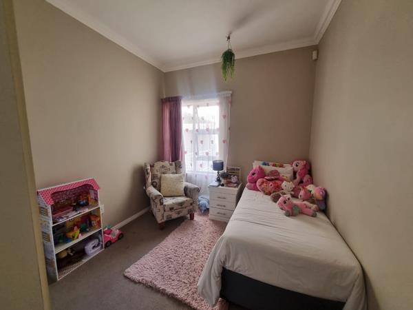 This large 3 bedroom first floor unit has a lot to offer. Comprising of 3 bedrooms, 2.5 bathrooms m.e.s & guest toilet, An open plan dining and lounge area leading onto the spacious covered balcony, equipped with built-in braai, with views over Thorn Valley Estate. The kitchen is neat with space for two under counter appliances. Additionally, the unit has: single lockup garage and single parking space, storeroom, prepaid electricity, fibre infrastructure, move-in ready. Portland Place features: children''s play area, indoor swimming pool and club house while the estate comprises immaculate gardens and walkways, ponds, another children''s play area and controlled access