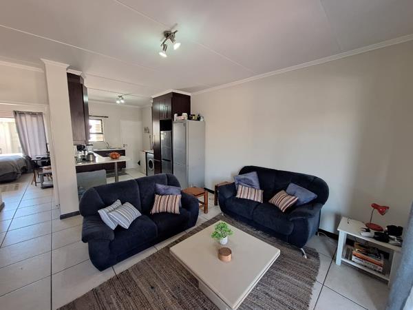 The open-plan layout boasts a functional kitchen, complete with a fridge and tumble dryer, seamlessly flowing into the lounge area. From here, step out onto the spacious balcony with a built-in braai perfect for entertaining or enjoying quiet evenings outdoors.
