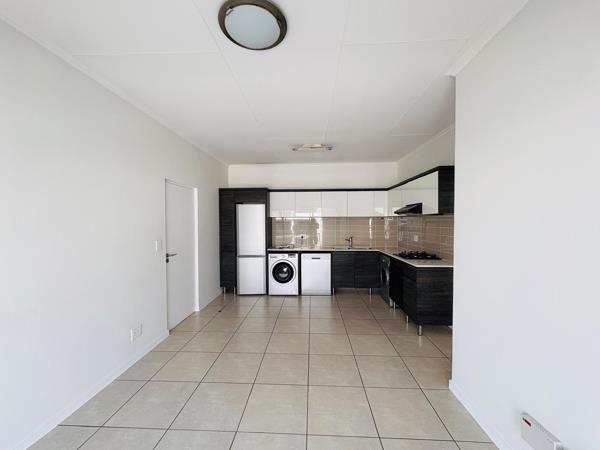 Step into a thoughtfully designed open-plan living area that flows seamlessly into a contemporary kitchen. This space boasts elegant Caesarstone countertops, a gas hob for efficient cooking, and a full suite of eco-friendly Defy appliances (including a fridge, washing machine, and tumble dryer). The living area extends to a private covered balcony, ideal for enjoying your morning coffee or simply unwinding. The apartment features a comfortable bedroom with ample built-in cupboards and a sleek en-suite bathroom, guaranteeing a private and convenient space.