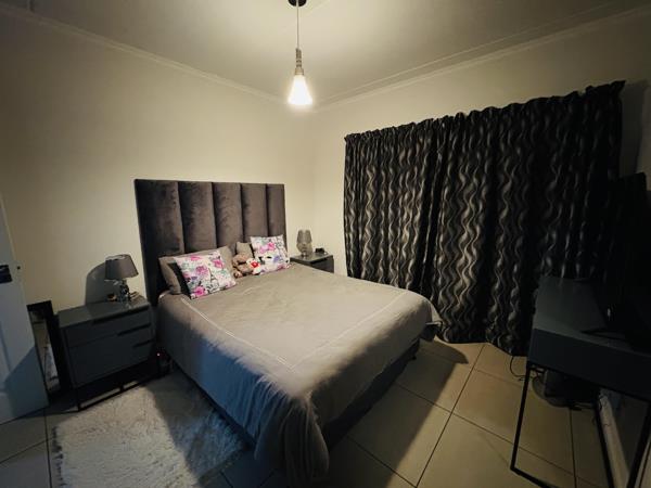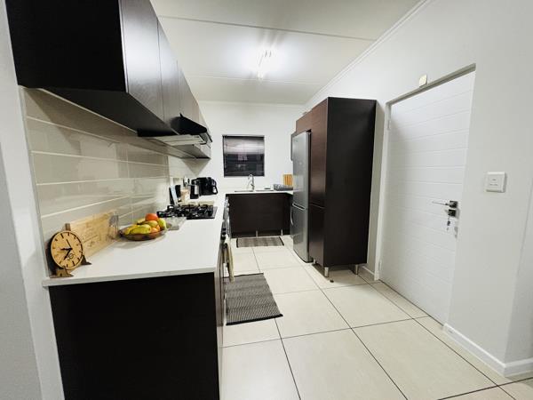 All three bedrooms are generously sized and feature built-in cupboards, while the master suite offers the luxury of its own en suite bathroom. A second sleek, fully tiled bathroom serves guests and family alike. Two covered parking bays are included for convenience and ease.