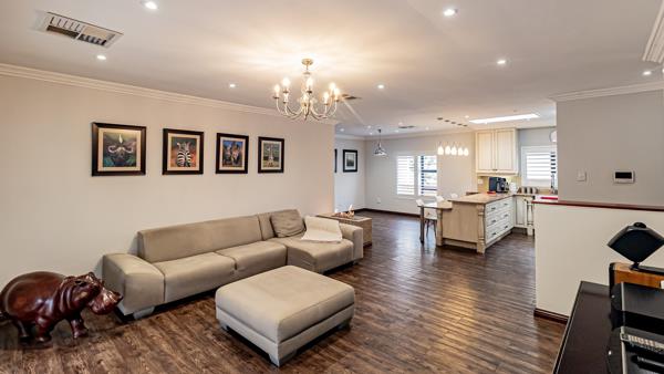 This beautifully appointed home, set within the secure and family-friendly Emerald Estate, is designed for effortless living and entertaining. The spacious living and dining areas flow seamlessly onto a large covered patio with fold-down blinds, a built-in braai, and elegant decking that frames a heated swimming pool, perfect for gatherings in any season. The homes gas fireplace adds warmth and ambiance, while central air conditioning ensures comfort throughout the year. Every detail has been considered, from the aluminium shutters that enhance security and style to the solar geyser and central vacuum system that offer modern convenience and efficiency.