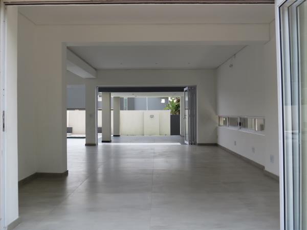 The open-plan layout showcases expansive living spaces where high ceilings and floor-to-ceiling windows flood the interior with natural light. Folding doors open seamlessly onto the outdoor entertainment area, creating a beautiful flow between the home and garden. The designer kitchen connects elegantly to the dining and lounge areas, making it the perfect setting for both family gatherings and refined entertaining, with a conveniently located guest bathroom.
