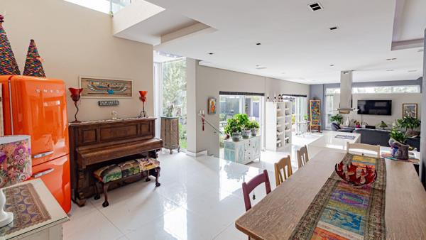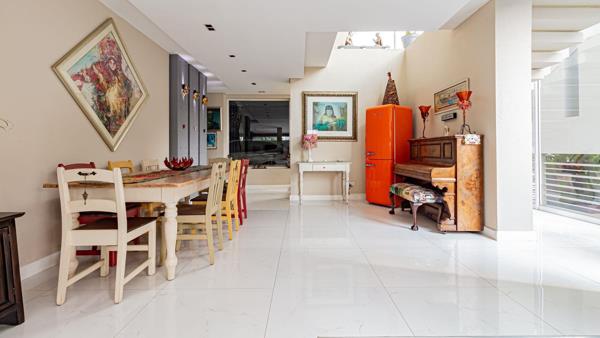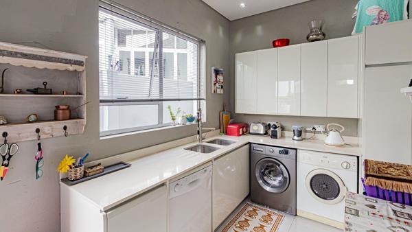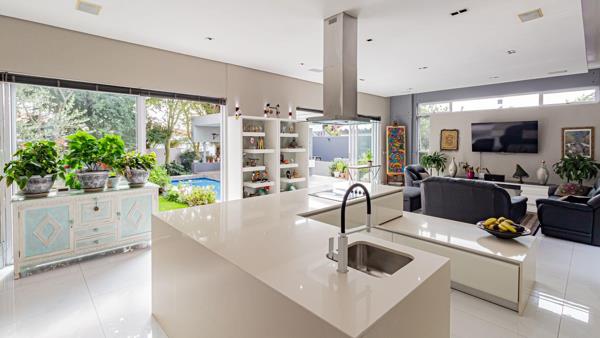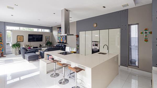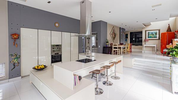 The spacious downstairs living area is a masterpiece of contemporary design, seamlessly integrating the lounge, dining area, and ultra-modem kitchen. The built-in speaker system enhances the ambiance, while large windows and sliding doors invite natural light, creating a bright and airy atmosphere. A separate scullery provides additional convenience, keeping the kitchen pristine and organised. The covered patio extends the living space outdoors, overlooking the sparkling pool, making it ideal for entertaining or unwinding in style. A guest bathroom downstairs adds to the home''s practicality.