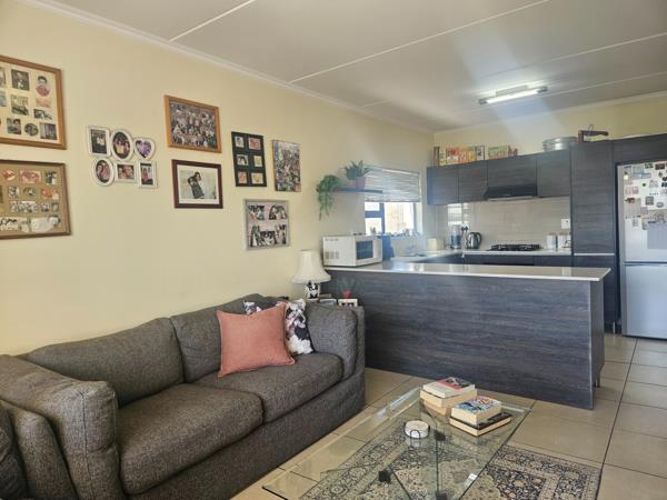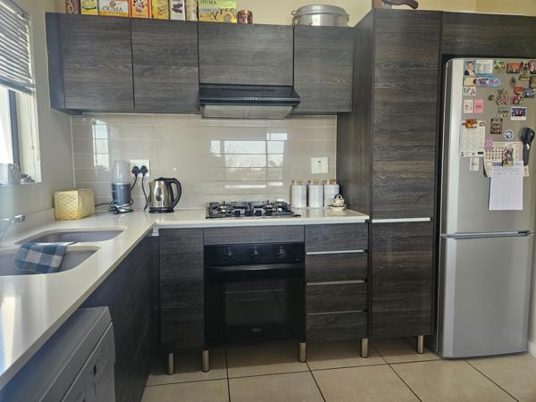 The well-proportioned open-plan lounge and dining area flows seamlessly into a sleek eat-in kitchen featuring a centre island, gas hob, electric oven, and quality Defy applianceswashing machine, tumble dryer, dishwasher, and fridgeall included in the sale.