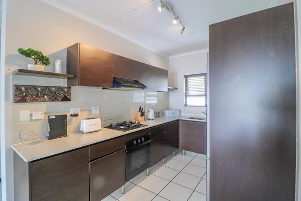 The modern kitchen is fitted with Defy appliances, a gas hob, ample cupboard space and white tops.