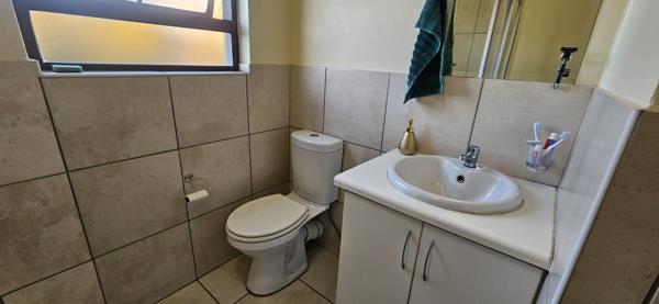 Both bedrooms are generously sized with built-in cupboards, and the main bedroom includes an en-suite bathroom. The second bathroom is conveniently located and finished with contemporary fittings.